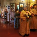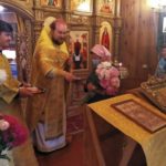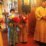 В завершение Литургии состоялось славление Всем святым земли Русской , после чего отец Андрей поздравил с Воскресным днём-малой Пасхой и радостью воспоминания подвигов и трудов Всех русских святых, и произнес слово поучения.