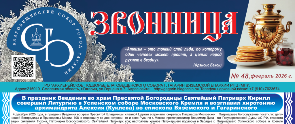 8 февраля 2026 года, в Неделю о блудном сыне, в день памяти Собора новомучеников и исповедников Церкви Русской, в Благовещенском соборе города Гагарин состоялась Божественная литургия, которую совершил благочинный церквей Гагаринского округа архимандрит Александр (Карпиков).