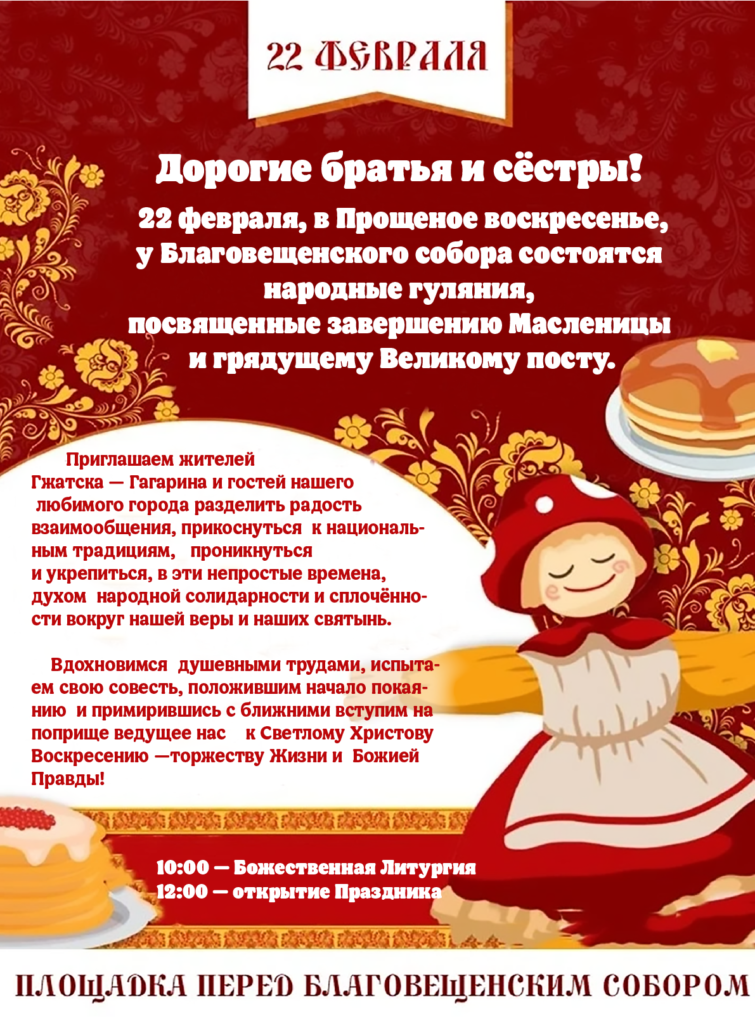 14 февраля, во Вселенскую родительскую субботу, в Благовещенском соборе состоялась заупокойная литургия, которую возглавил благочинный церквей Гагаринского округа архимандрит Александр Карпиков. Его Высокопреподобию сослужил иерей Роман Ступа.